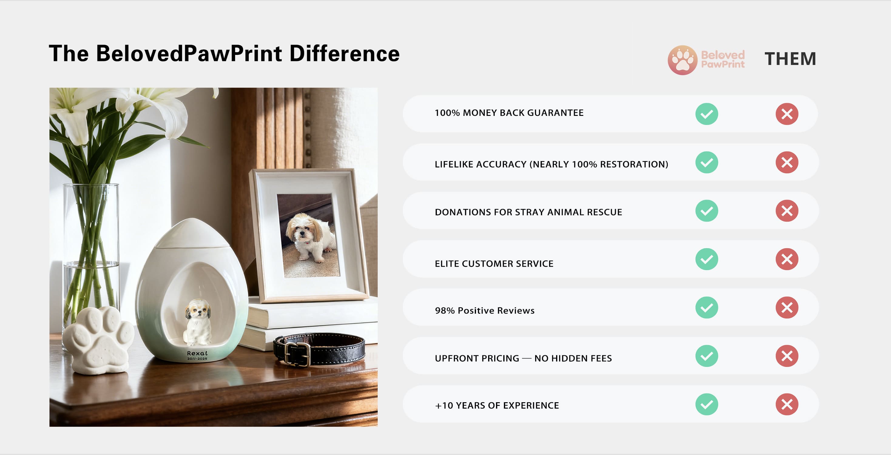 Every pet memorial is 100% handmade. This urn isn’t just a container—it’s a unique tribute crafted for your beloved pet. We handcraft each piece and recreate their likeness from your photo, adding their name and your personal message, so every detail truly captures their spirit.