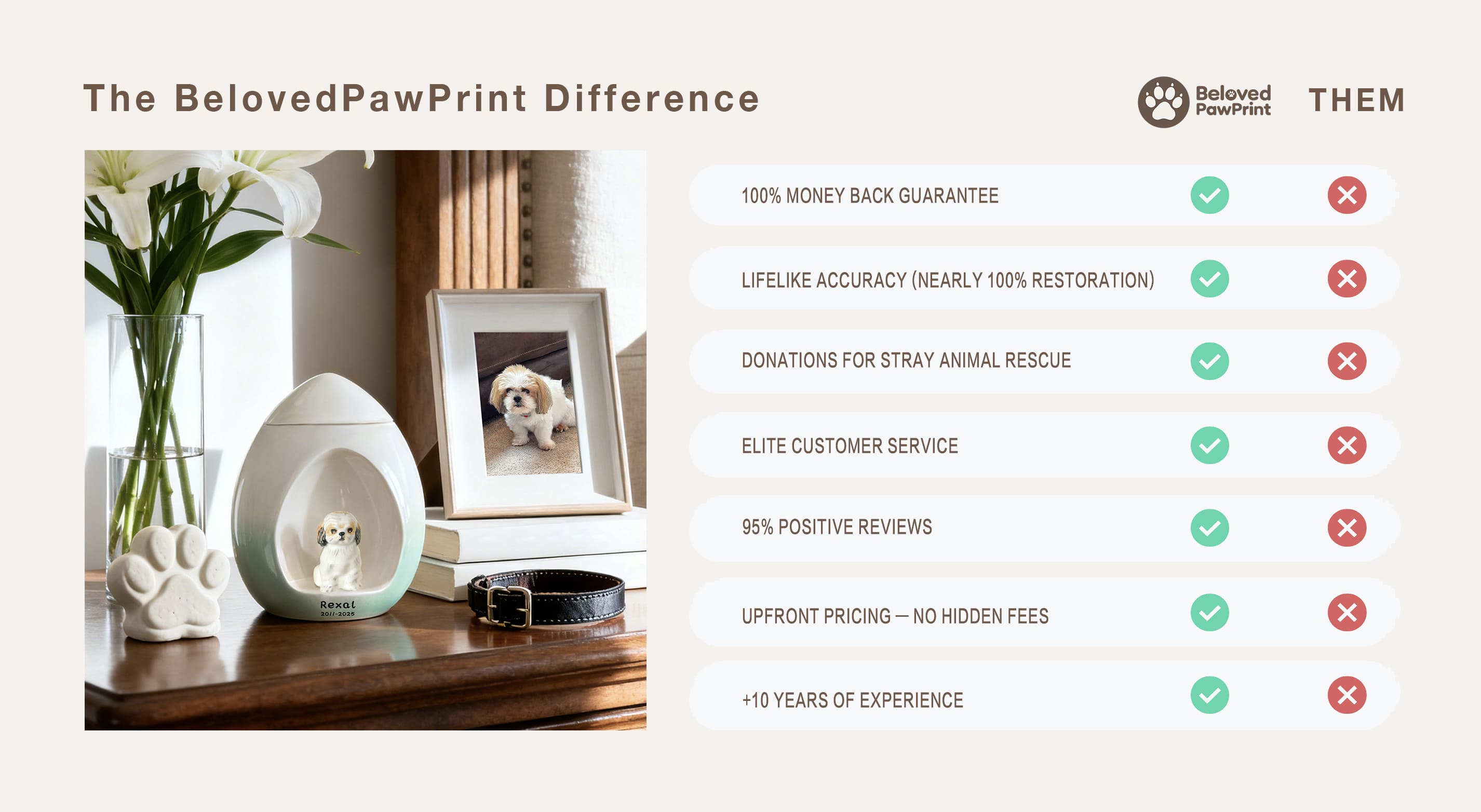 Every pet memorial is 100% handmade. This urn isn’t just a container—it’s a unique tribute crafted for your beloved pet. We handcraft each piece and recreate their likeness from your photo, adding their name and your personal message, so every detail truly captures their spirit.